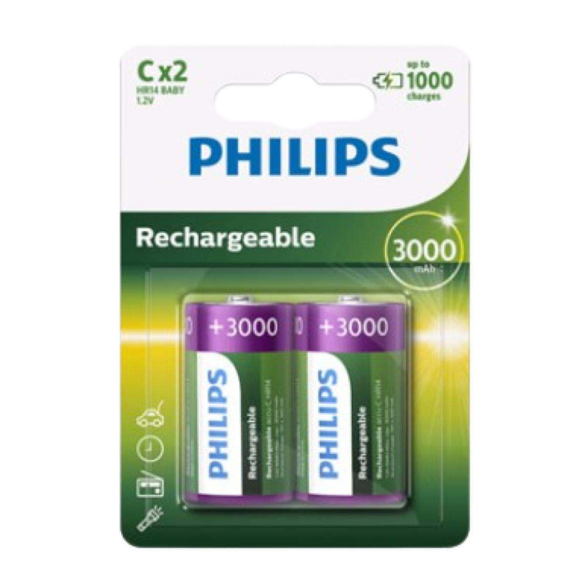 2 Pilhas Baterias C Recarregáveis Philips Tamanho Média 3000Mah